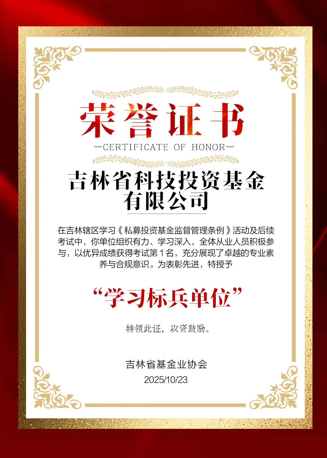 • 我公司榮獲吉林省基金業(yè)協(xié)會(huì)《私募投資基金監(jiān)督管理?xiàng)l例》知識(shí)競(jìng)賽第一名,獲評(píng)“學(xué)習(xí)標(biāo)兵單位”