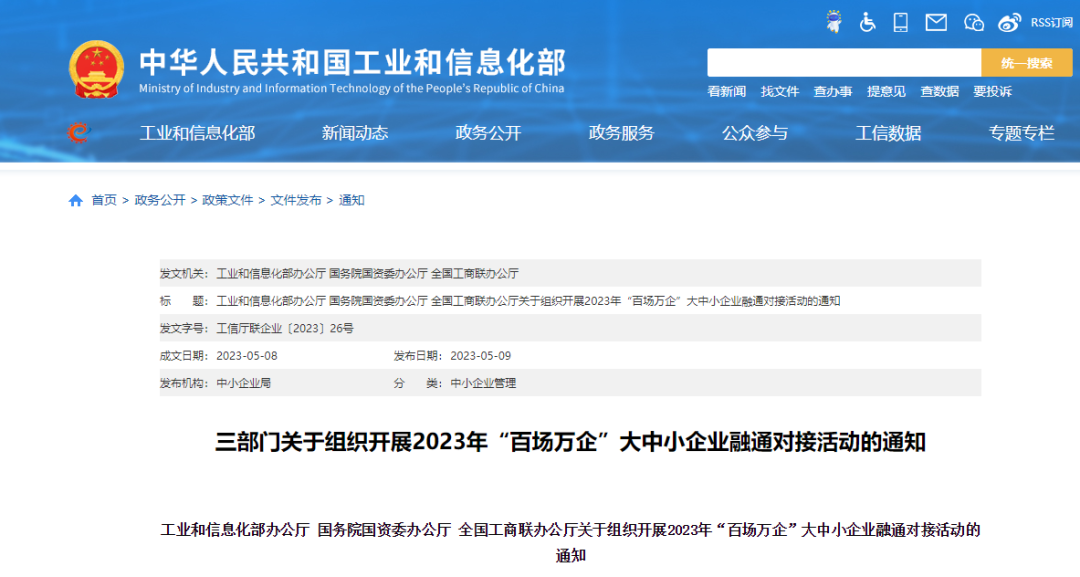 日前,工信部網(wǎng)站發(fā)布三部門關(guān)于組織開展2023年“百場萬企”大中小企業(yè)融通對接活動的通知。