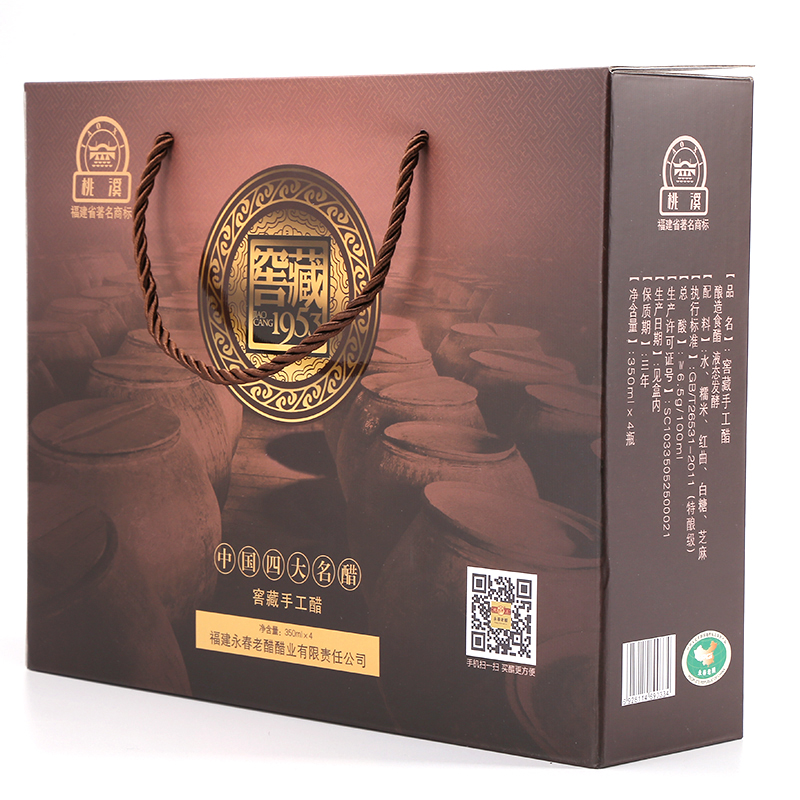 選用優(yōu)質糯米、紅曲、芝麻、原產地水源等為原料,傳承千年獨特釀造工藝(液態(tài)深層發(fā)酵),純糧釀造;在半地下室的窖藏車間里,按照古法釀造工藝,純手工制醋,經年累月,邊發(fā)酵邊陳釀,平均陳釀時間十年起,酸度6.5左右。故產出的老醋香味醇厚,濃酸微甜,零添加劑,回味悠長,是永春老醋中的精品。采用精美的禮盒包裝,適合送禮親朋,有禮有面!