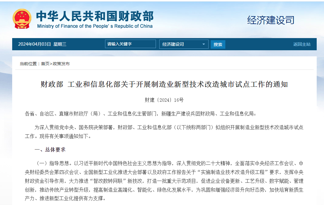 近日,財(cái)政部、工業(yè)和信息化部發(fā)布《關(guān)于開(kāi)展制造業(yè)新型技術(shù)改造城市試點(diǎn)工作的通知》(以下簡(jiǎn)稱(chēng)“《通知》”)。