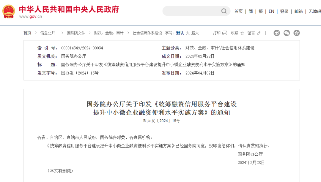 國(guó)辦發(fā)文:統(tǒng)籌融資信用服務(wù)平臺(tái)建設(shè),提升中小微企業(yè)融資便利水平