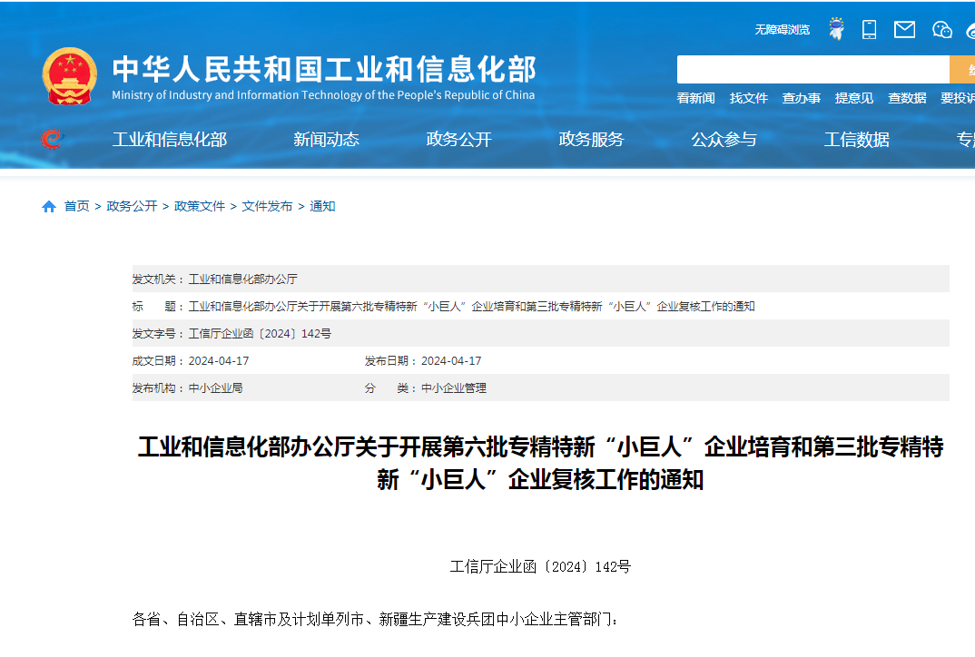 近日工業(yè)和信息化部印發(fā)通知,組織開(kāi)展第六批專(zhuān)精特新“小巨人”企業(yè)培育和第三批專(zhuān)精特新“小巨人”企業(yè)復(fù)核工作。